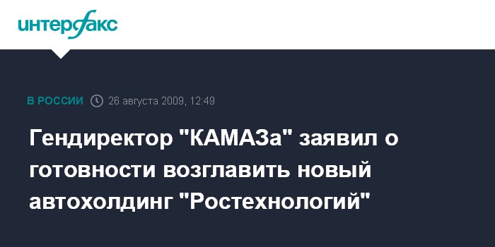 Москва. 26 августа. INTERFAX.RU - Глава ОАО "КАМАЗ" готов возглавить формируемый автомобильный холдинг госкорпорации "Ростехнологии".