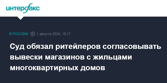 Москва. 1 августа. INTERFAX.RU - Размещение фирменного оформления магазинов на фасадах жилых домов возможно только с согласия собственников помещений дома, если они не соответствуют муниципальным требованиям к устанавливаемым бесплатно информационным табличкам о юридическом лице и графике его работы, решил Верховный суд России.