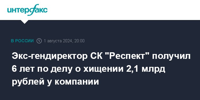 Экс-гендиректор СК "Респект" получил 6 лет по делу о хищении 2,1 млрд рублей у компании