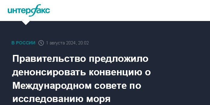 Москва. 1 августа. INTERFAX.RU - Премьер-министр Михаил Мишустин подписал постановление, предлагающее денонсировать конвенцию о Международном совете по исследованию моря, документ опубликован на официальном портале правовой информации.