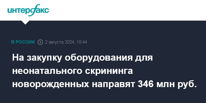 Москва. 2 августа. INTERFAX.RU - Правительство России дополнительно направит свыше 346,3 млн рублей на закупку оборудования для расширенного неонатального скрининга новорожденных.