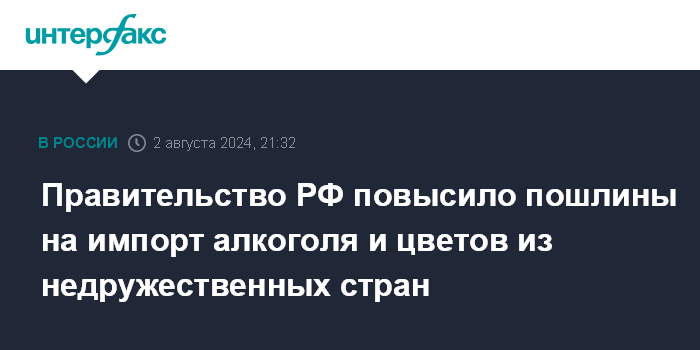 Москва. 2 августа. INTERFAX.RU - Правительство РФ повысило импортные пошлины на алкогольную продукцию и цветы из недружественных стран.