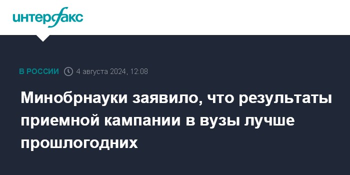 Москва. 4 августа. INTERFAX.RU - Минобрнауки России отмечает, что на текущий момент результаты приемной кампании оказались лучше, чем в 2023 году, многие университеты повысили качество отбора абитуриентов, сообщили журналистам в пресс-службе Минобрнауки.