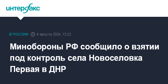 Москва. 4 августа. INTERFAX.RU - Российская армия взяла под контроль село Новоселовка Первая в Донецкой народной республике, сообщило Минобороны РФ в воскресенье.