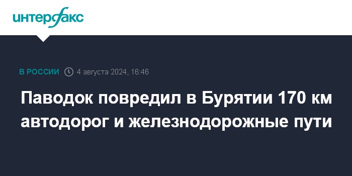 Москва. 4 августа. INTERFAX.RU - Паводок в Бурятии, где введен режим ЧС республиканского масштаба, повредил 170 км автодорог и железнодорожный участок в районе угольного разреза, сообщил губернатор Алексей Цыденов.