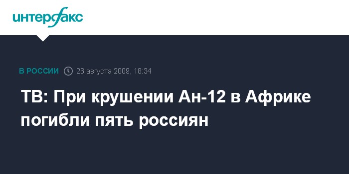 Москва. 26 августа. INTERFAX.RU - Жертвами крушения самолета Ан-12 в республике Конго стали пять россиян, сообщил в среду вечером Первый канал.