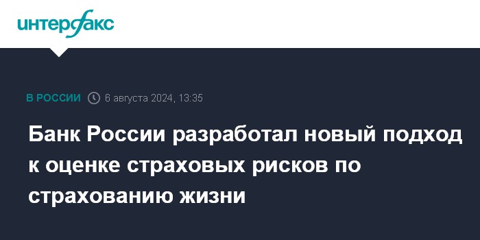 Москва. 6 августа. INTERFAX.RU - Банк России разработал проект указания, который вводит новый подход к оценке страховых рисков по страхованию жизни, представленный в опубликованной регулятором 16 июля "Концепции расчета страховых рисков по страхованию жизни. Изменения положения 781-П".