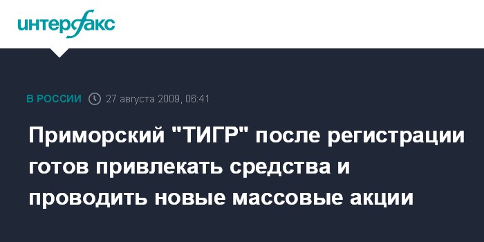 Владивосток. 27 августа. ИНТЕРФАКС - ДАЛЬНИЙ ВОСТОК - Лидеры недавно зарегистрированной правозащитной организации Приморья "ТИГР" (Товарищество инициативных граждан региона) заявили о новых акциях протеста в защиту социальных прав жителей страны.
