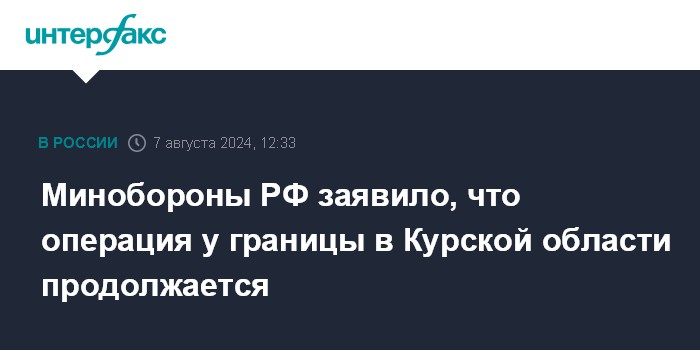 Москва. 7 августа. INTERFAX.RU - Российские военные и пограничники в течение ночи продолжали уничтожать украинские формирования вблизи границы РФ в Курской области, операция не закончена, сообщили в Минобороны РФ.