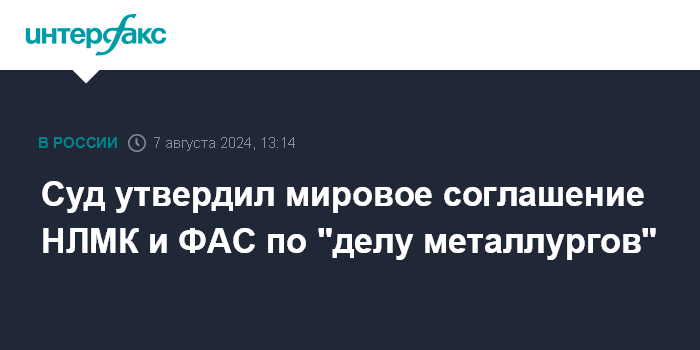 Москва. 7 августа. INTERFAX.RU - Арбитражный суд Москвы утвердил мировое соглашение Федеральной антимонопольной службы и ПАО "Новолипецкий металлургический комбинат" по "делу металлургов", передал корреспондент "Интерфакса" из суда.