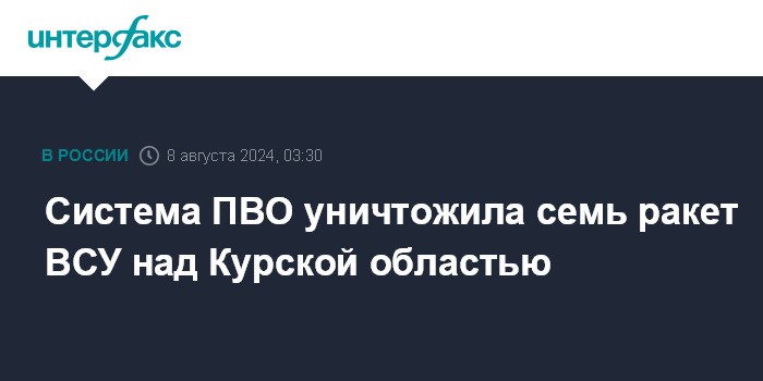 Москва. 8 августа. INTERFAX.RU - Врио губернатора Курской области Алексей Смирнов сообщил об уничтожении силами ПВО семи украинских ракет.