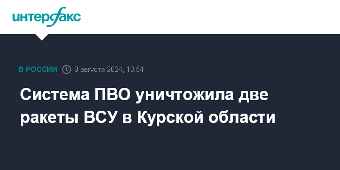 Москва. 8 августа. INTERFAX.RU - Врио губернатора Курской области Алексей Смирнов сообщил об уничтожении двух ракет ВСУ над территорией региона.