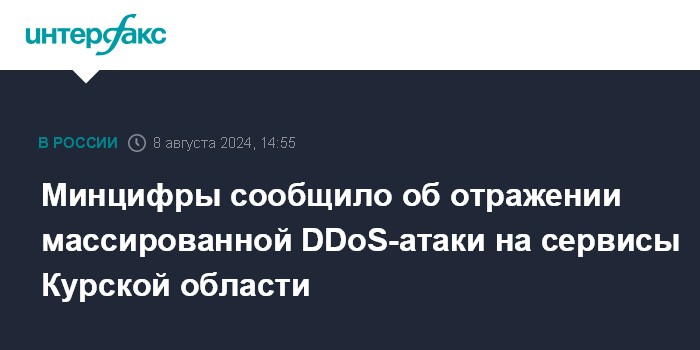 Москва. 8 августа. INTERFAX.RU - Минцифры России заявляет об отражении массированной DDoS-атаки на сервисы Курской области, восстановлении их работы и надежной защите данных пользователей.
