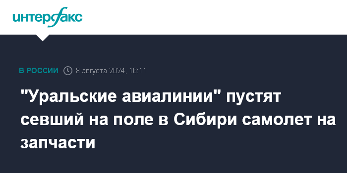 Москва. 8 августа. INTERFAX.RU - "Уральские авиалинии" приняла решение о дальнейшей судьбе самолета, в сентябре 2023 года севшего в поле в Новосибирской области, он будет разобран на запчасти, сообщил "Интерфаксу" основатель авиакомпании Сергей Скуратов.