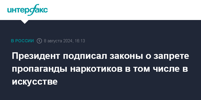 Москва. 8 августа. INTERFAX.RU - Президент Владимир Путин подписал пакет законов о запрете пропаганды в стране наркотиков, а также об уголовной и административной ответственности за такую пропаганду. Законы опубликованы на официальном портале правовой информации.
