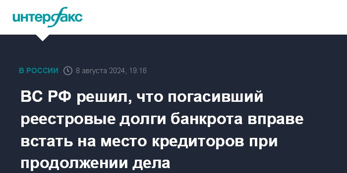 ВС РФ решил, что погасивший реестровые долги банкрота вправе встать на место кредиторов при продолжении дела