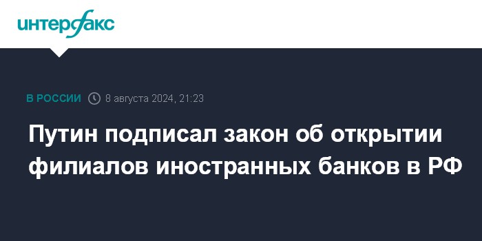 Москва. 8 августа. INTERFAX.RU - Президент РФ Владимир Путин подписал закон, позволяющий иностранным банкам открывать филиалы в России.