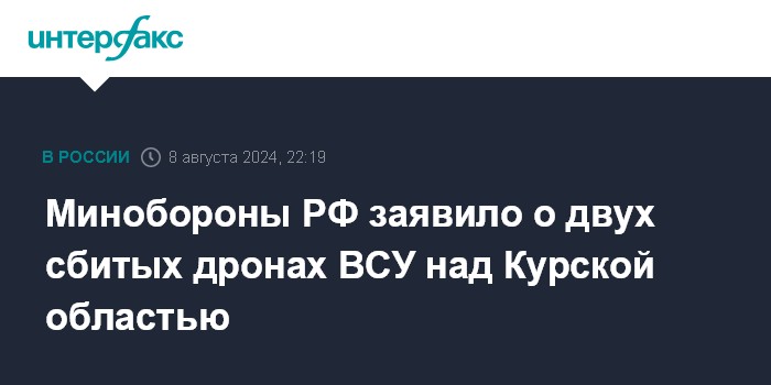 Москва. 8 августа. INTERFAX.RU - Российские военные около 20:25 и 20:55 по Москве уничтожили два украинских беспилотника самолетного типа в небе над Курской областью, заявили в Минобороны РФ в четверг.