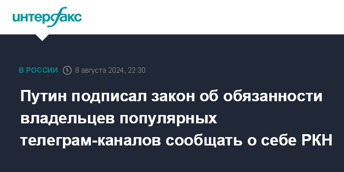 Путин подписал закон об обязанности владельцев популярных телеграм-каналов сообщать о себе РКН