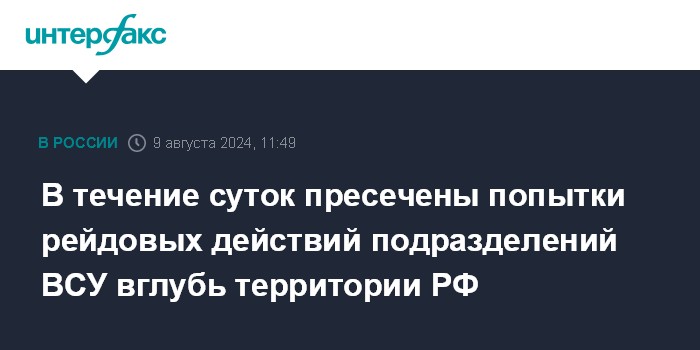 Москва. 9 августа. INTERFAX.RU - Минобороны России заявило, что в течение суток группировка "Север" пресекла попытки рейдовых действий подразделений ВСУ вглубь российской территории на Курском направлении.