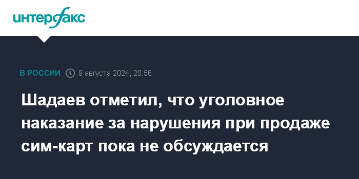 Москва. 9 августа. INTERFAX.RU - Минцифры России не обсуждает введение уголовной ответственности за неоднократное нарушение требований по продаже сим-карт. Об этом сообщил в пятницу журналистам министр цифрового развития, связи и массовых коммуникаций Максут Шадаев.