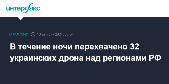 В течение ночи перехвачено 32 украинских дрона над регионами РФ