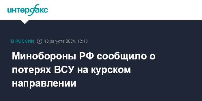Москва. 10 августа. INTERFAX.RU - Потери вооруженных сил Украины (ВСУ) за сутки на курском направлении составили до 175 военнослужащих и 36 единиц бронетехники, заявили в Минобороны РФ в субботу.
