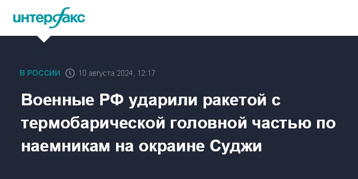 Москва. 10 августа. INTERFAX.RU - Российские военные заявили о пресечении попыток мобильных групп ВСУ прорваться вглубь Курской области, ударе ракетой с термобарической головной частью по иностранным наемникам на южной окраине Суджи.
