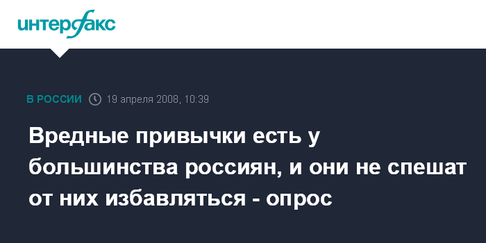 Москва. 19 апреля. ИНТЕРФАКС - Две трети россиян признают, что у них лично имеется как минимум одна, а то и больше вредных привычек.