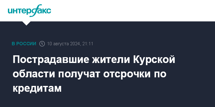 Москва. 10 августа. INTERFAX.RU - Временно исполняющий обязанности губернатора Курской области Алексей Смирнов сообщил, что жители региона, пострадавшие от ЧС, получат отсрочки по кредитам.