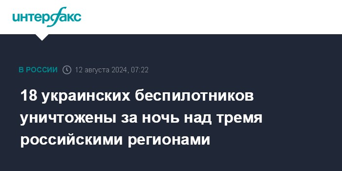 Москва. 12 августа. INTERFAX.RU - Средствами противовоздушной обороны за прошедшую ночь были сбиты 18 украинских беспилотников самолетного типа над тремя регионами РФ, сообщило российское Минобороны в понедельник утром.