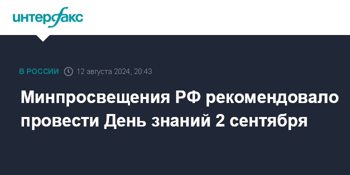 Москва. 12 августа. INTERFAX.RU - Минпросвещения РФ рекомендует провести в этом году торжественные мероприятия в школах по случаю Дня знаний 2 сентября, сообщили журналистам в пресс-службе.