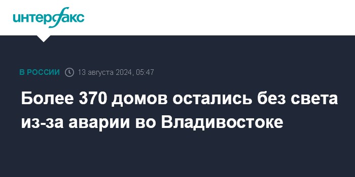 Москва. 13 августа. INTERFAX.RU - Авария оставила без света жителей более 370 домов во Владивостоке, организована проверка, сообщила региональная прокуратура