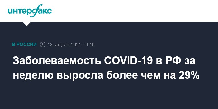 Москва. 13 августа. INTERFAX.RU - Заболеваемость COVID-19 в России с 5 по 11 августа выросла по сравнению с предшествующей неделей на 29,1%, сообщил во вторник оперативный штаб по борьбе с коронавирусной инфекцией.