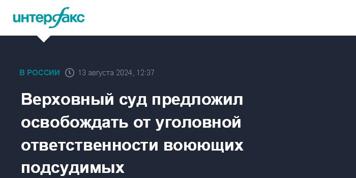 Москва. 13 августа. INTERFAX.RU - Верховный суд России подготовил законопроект о возможности освобождения от уголовной ответственности на стадии рассмотрения дела судом подсудимых призывников, контрактников, мобилизованных и проходящих службу в период военного положения или военного времени.