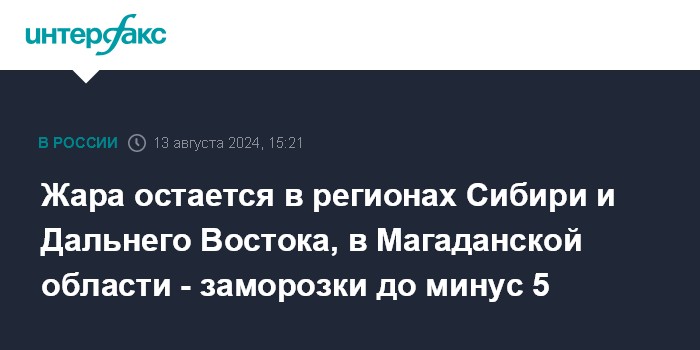 Жара остается в регионах Сибири и Дальнего Востока, в Магаданской области - заморозки до минус 5