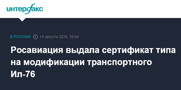 Москва. 14 августа. INTERFAX.RU - Росавиация выдала ПАО "Ил" (входит в ПАО "Объединенная авиастроительная корпорация" "Ростеха") сертификат типа на модификации транспортного самолета Ил-76: действие документа распространяется на самолеты Ил-76ТД-90 и Ил-76ТД-90ВД.