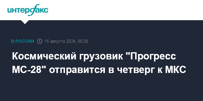Москва. 15 августа. INTERFAX.RU - Транспортный грузовой корабль "Прогресс МС-28", как ожидается, в четверг отправится к Международной космической станции (МКС) с космодрома Байконур.