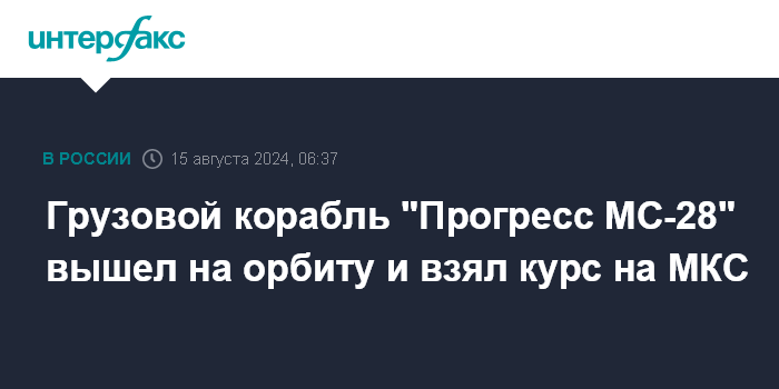 Москва. 15 августа. INTERFAX.RU - Ракета-носитель "Союз-2.1а" вывела на орбиту транспортный грузовой корабль "Прогресс МС-28", следует из трансляции "Роскосмоса".