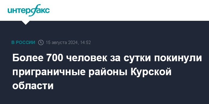 Москва. 15 августа. INTERFAX.RU - Из приграничных районов Курской области за сутки выехали свыше 720 человек, сообщает пресс-служба МЧС РФ в четверг.