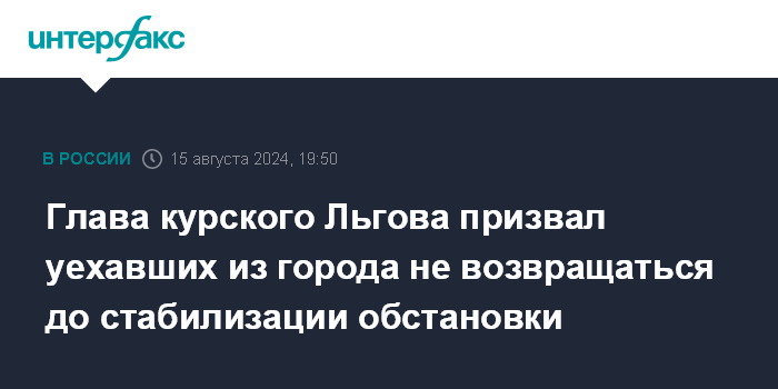Москва. 15 августа. INTERFAX.RU - Глава города Льгова Курской области Алексей Клемешов в четверг обратился к местным жителям в связи со сложной оперативной обстановкой и рекомендовал тем, кто выехал из населенного пункта, не возвращаться до ее стабилизации.