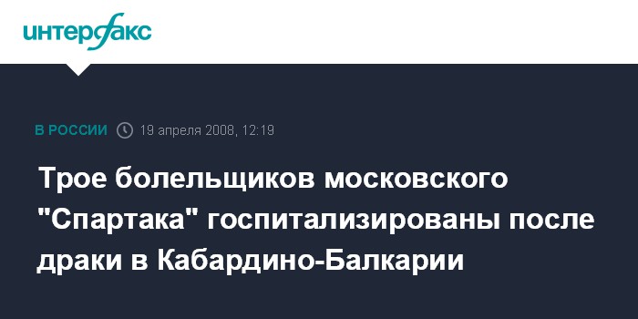Нальчик. 19 апреля. ИНТЕРФАКС-ЮГ - Трое болельщиков московского футбольного клуба "Спартак", прибывших на матч со "Спартаком" (Нальчик), пострадали в массовой драке в Приэльбрусье в ночь на субботу, сообщил агентству "Интерфакс-Юг" источник в правоохранительных органах Кабардино-Балкарии.