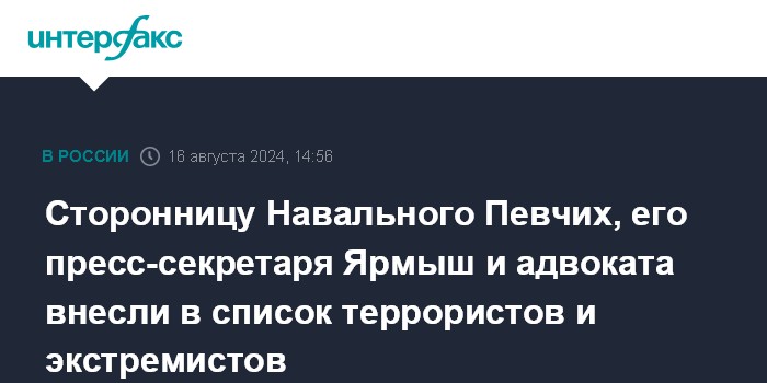 Москва. 16 августа. INTERFAX.RU - Росфинмониторинг внес сторонницу Алексея Навального Марию Певчих (признана в РФ иноагентом), его адвоката Ольгу Михайлову и бывшего пресс-секретаря Киру Ярмыш (признана в РФ иноагентом) в перечень лиц и организаций, в отношении которых имеются сведения об их причастности к экстремистской деятельности или террору.