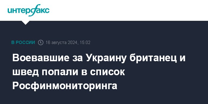 Москва. 16 августа. INTERFAX.RU - Росфинмониторинг внес бойцов из Великобритании, Швеции и Хорватии в перечень лиц и организаций, в отношении которых имеются сведения об их причастности к экстремистской деятельности или террору. Соответствующие записи появились в списке 16 августа.