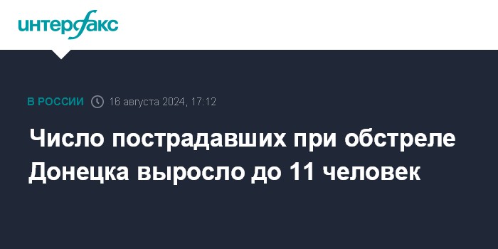 Москва. 16 августа. INTERFAX.RU - До 11 увеличилось количество мирных жителей, пострадавших в результате обстрела Донецка в пятницу, сообщил глава Донецкой народной республики Денис Пушилин.