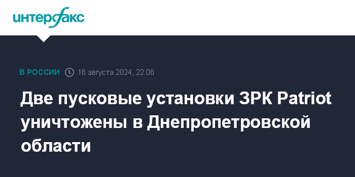 Москва. 16 августа. INTERFAX.RU - Минобороны России сообщило об уничтожении позиции ЗРК Patriot ВСУ В Днепропетровской области.