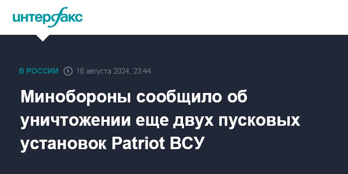 Москва. 16 августа. INTERFAX.RU - Министерство обороны России сообщило об уничтожении комплексом "Искандер-М" двух пусковых установок комплекса ПВО Patriot армии Украины.