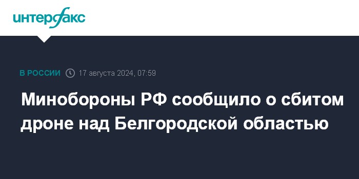 Москва. 17 августа. INTERFAX.RU - Силы противовоздушной обороны нейтрализовали за минувшую ночь БПЛА самолетного типа над Белгородской областью, сообщило Минобороны России в субботу.
