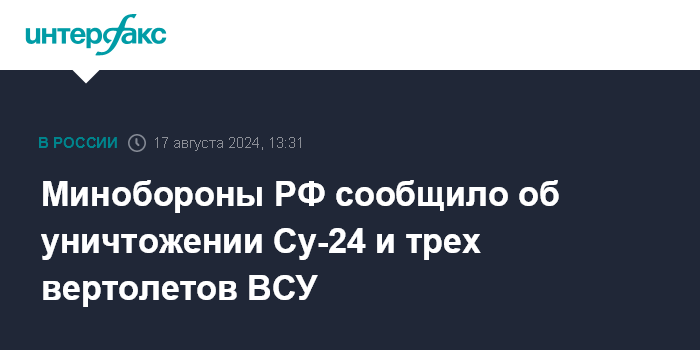 Москва. 17 августа. INTERFAX.RU - Вооруженные силы России за минувшие сутки уничтожили на аэродромах бомбардировщик Су-24 и три вертолета воздушных сил Украины - два Ми-8 и Ми-17, сообщает министерство обороны РФ в субботу.