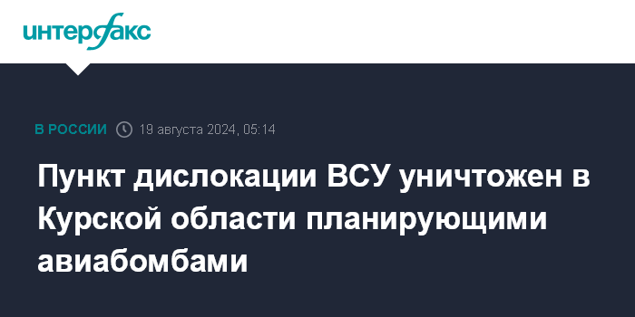 Москва. 19 августа. INTERFAX.RU - Экипаж самолёта Су-34 Воздушно-космических сил России нанёс ночью удар по пункту временной дислокации (ПВД) подразделения вооружённых сил Украины и его бронированной технике в приграничном районе Курской области, сообщило министерство обороны РФ.